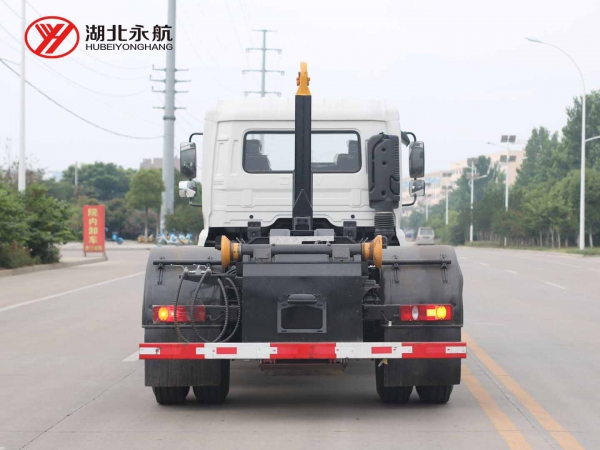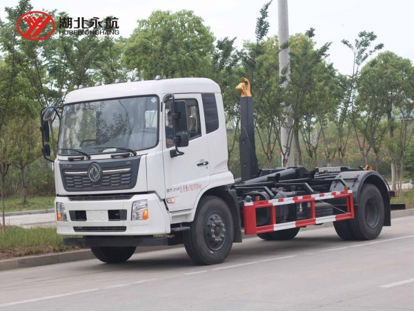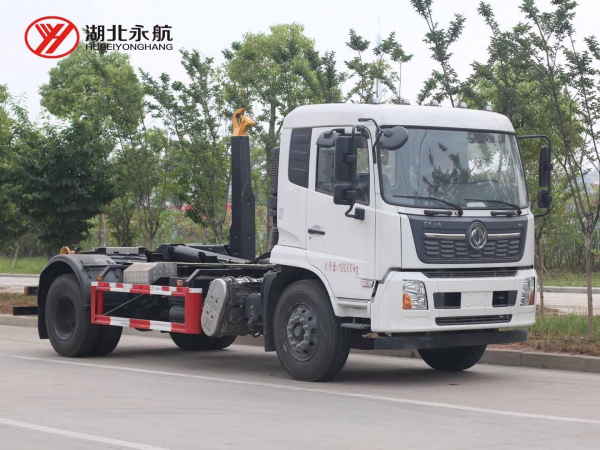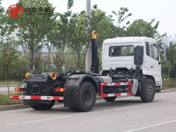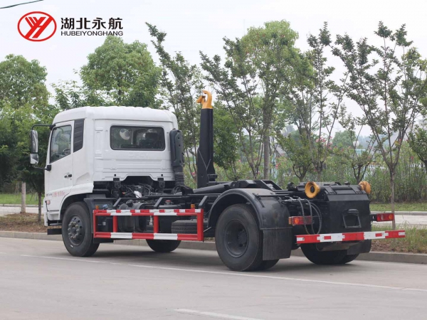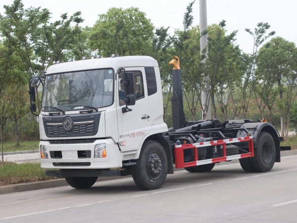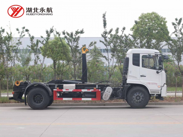 该车主要由拉臂钩总成、可移动箱体总成、液压系统、液压锁紧总成、电液操作系统组成,能实现一车与多个垃圾箱联合循环作业运输,整车具有结构简单、操作方便、装卸效率高、机械自动化程度高、节省人力的优点。