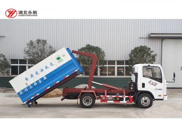 该车主要由拉臂钩总成、可移动箱体总成、液压系统、液压锁紧总成、电液操作系统组成,能实现一车与多个垃圾箱联合循环作业运输,整车具有结构简单、操作方便、装卸效率高、机械自动化程度高、节省人力的优点。