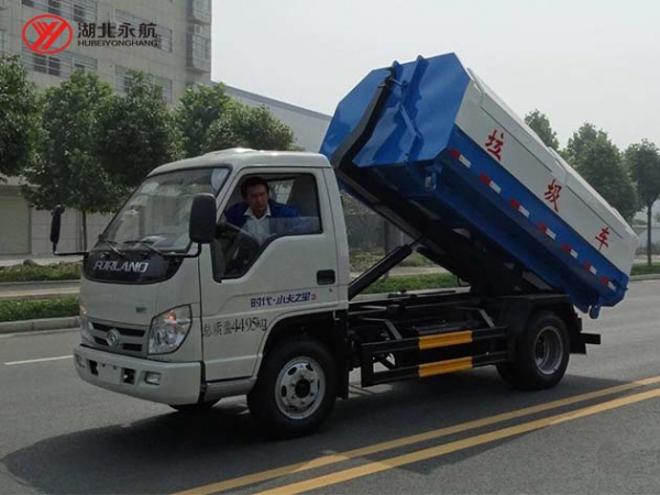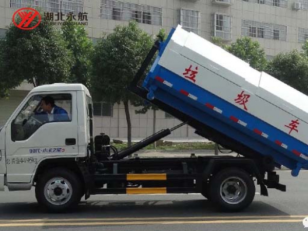 该车主要由拉臂钩总成、可移动箱体总成、液压系统、液压锁紧总成、电液操作系统组成,能实现一车与多个垃圾箱联合循环作业运输,整车具有结构简单、操作方便、装卸效率高、机械自动化程度高、节省人力的优点。