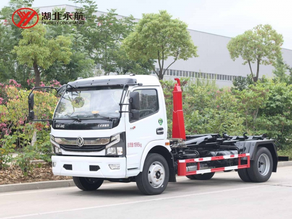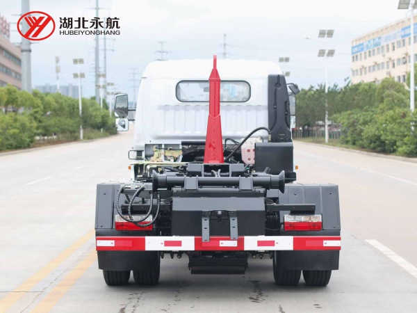 该车主要由拉臂钩总成、可移动箱体总成、液压系统、液压锁紧总成、电液操作系统组成,能实现一车与多个垃圾箱联合循环作业运输,整车具有结构简单、操作方便、装卸效率高、机械自动化程度高、节省人力的优点。