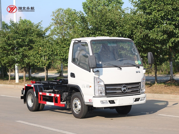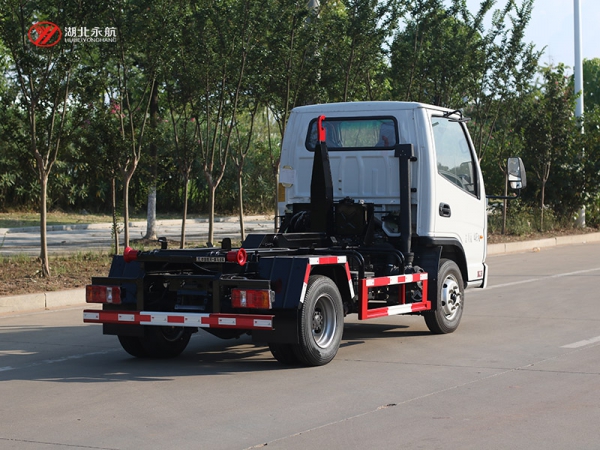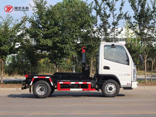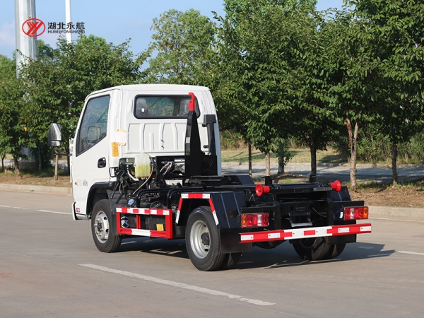 该车主要由拉臂钩总成、可移动箱体总成、液压系统、液压锁紧总成、电液操作系统组成,能实现一车与多个垃圾箱联合循环作业运输,整车具有结构简单、操作方便、装卸效率高、机械自动化程度高、节省人力的优点。