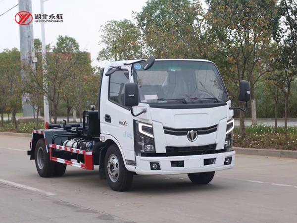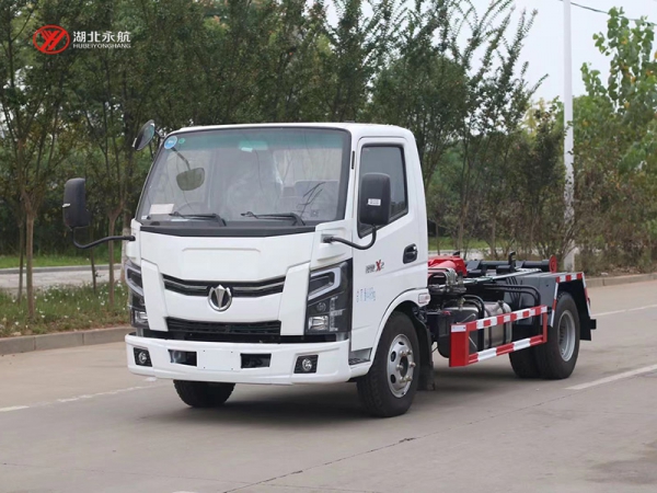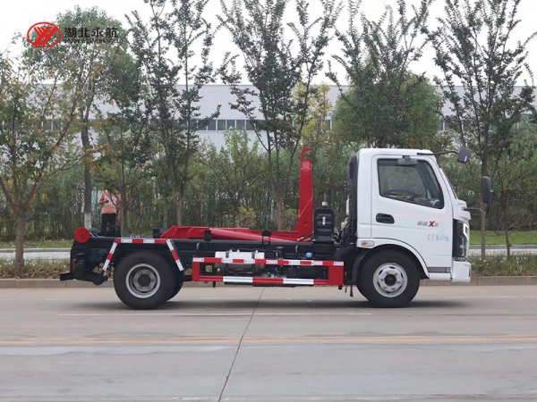 该车主要由拉臂钩总成、可移动箱体总成、液压系统、液压锁紧总成、电液操作系统组成,能实现一车与多个垃圾箱联合循环作业运输,整车具有结构简单、操作方便、装卸效率高、机械自动化程度高、节省人力的优点。