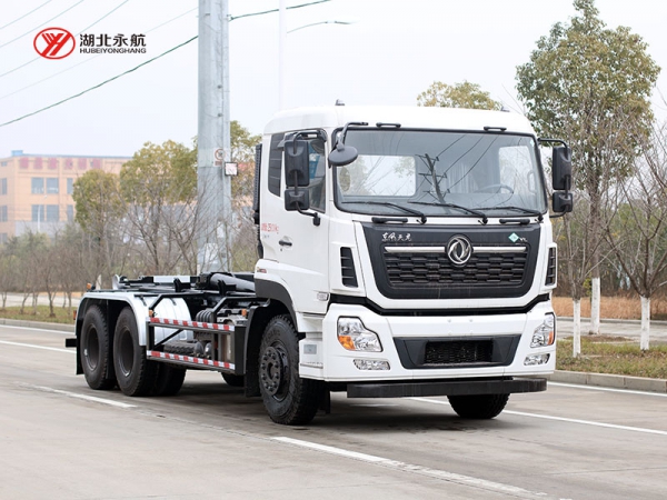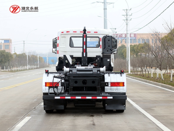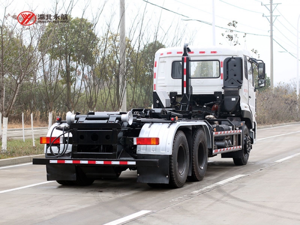 该车主要由拉臂钩总成、可移动箱体总成、液压系统、液压锁紧总成、电液操作系统组成,能实现一车与多个垃圾箱联合循环作业运输,整车具有结构简单、操作方便、装卸效率高、机械自动化程度高、节省人力的优点。