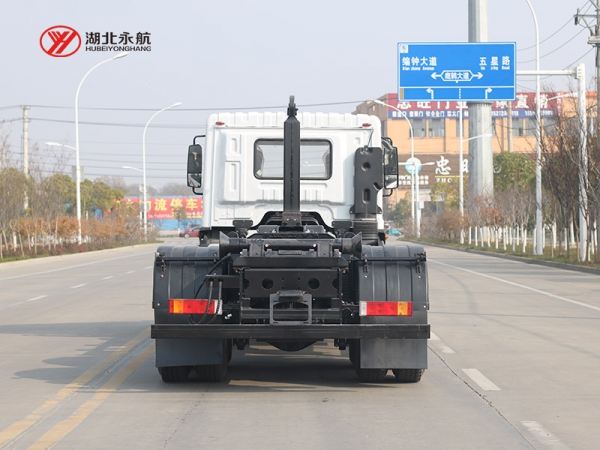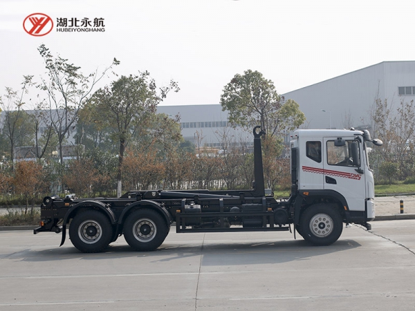 该车主要由拉臂钩总成、可移动箱体总成、液压系统、液压锁紧总成、电液操作系统组成,能实现一车与多个垃圾箱联合循环作业运输,整车具有结构简单、操作方便、装卸效率高、机械自动化程度高、节省人力的优点。