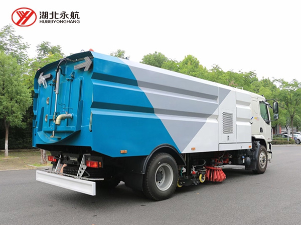 该车集扫路车、洒水车和高压清洗车功能于一体,采用“中置两立扫+中置宽吸嘴(内置高压水喷杆)+左右高压侧喷杆”的结构。