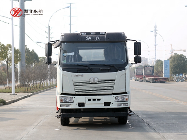 采用一汽解放J6L半浮平顶小排半驾驶室、全新内饰、电动玻璃升降、手动后视镜、驾驶员座椅为机械减震座椅、单DIN北斗兼容车载系统、标配巡航开关,大柴CA4DK1-22E6(EGR+DOC+DPF+SCR气驱),轴距4500mm,陕齿8JS85E变速器,车桥Ф378铸造桥(自动调整臂、国产ABS),速比4.875,237×75×(7+4),10.00R20型18层级,自动空调、前下防护装置、金属保险杠、铝散热器、手动液压举升装置、悬架10/12+8、200L钢油箱(带上装进回油口)、组合开关PTO控制方式、后悬1850mm、VOSS接头、驾驶室带2kg干粉灭火器1个、发动机体现5万公里长换油周期、下置圆筒式后处理、右转弯音响提示、驾驶室内PTO定速功能,预留驾驶室外一键定转速线束接头、限速89km/h、预留取力器控制机构、T-box1.1、安全带佩戴提醒、制动器衬片更换报警。