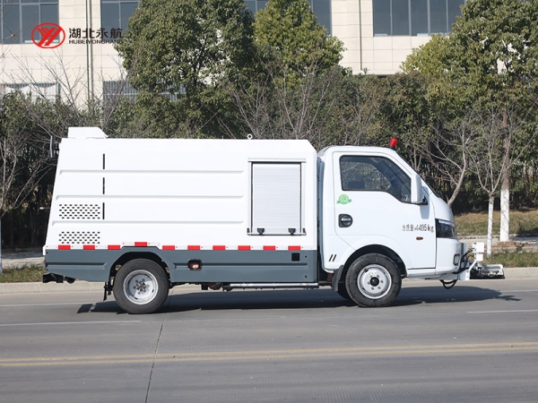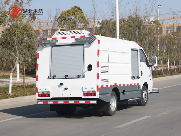 路面养护车采用国内知名品牌底盘改装,加装高压清洗机系统、整体式水箱(含清水仓、工具仓、动力仓)、前喷水架及定点清洗装置、电气系统、高压水路及卷盘装置、辅助清洗推车等部件。