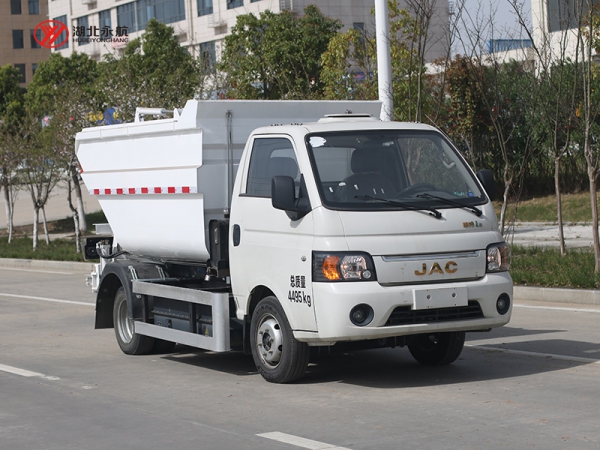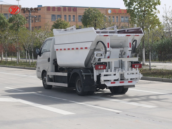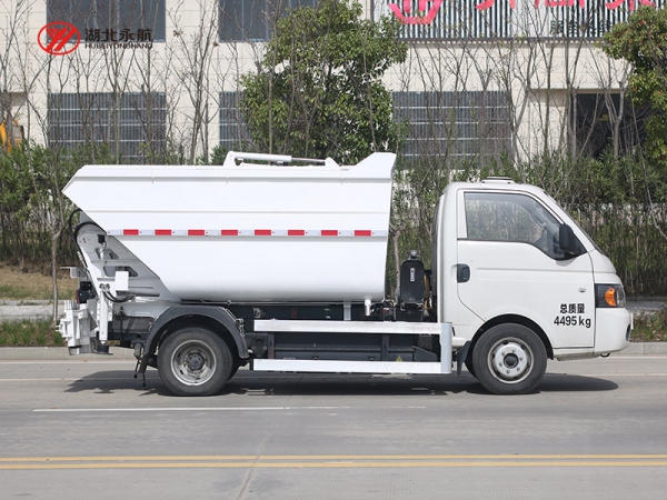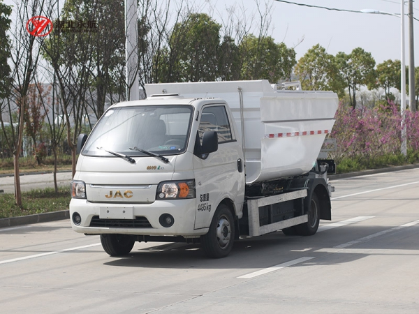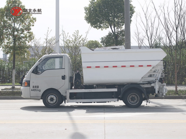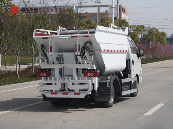 该车采用二类汽车底盘,加装高位倾翻垃圾箱、翻桶机构、刮板压缩装置、液压系统和电控系统,整车外形美观、驾驶舒适、操纵便捷、机动灵活。