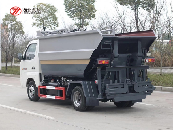该车采用二类汽车底盘,加装高位倾翻垃圾箱、翻桶机构、刮板滑板压缩装置、液压系统和电控系统,整车外形美观、驾驶舒适、操纵便捷、机动灵活。