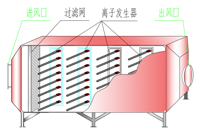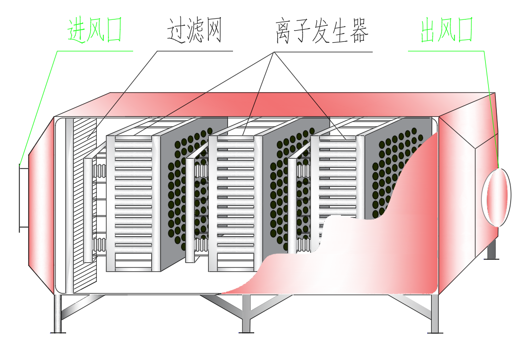 等离子废气净化器包含壳体、过滤网、离子发生器及进出风口。离子发生器分为等离子管脉冲式高频高压发生器和蜂窝电场式高压发生器。