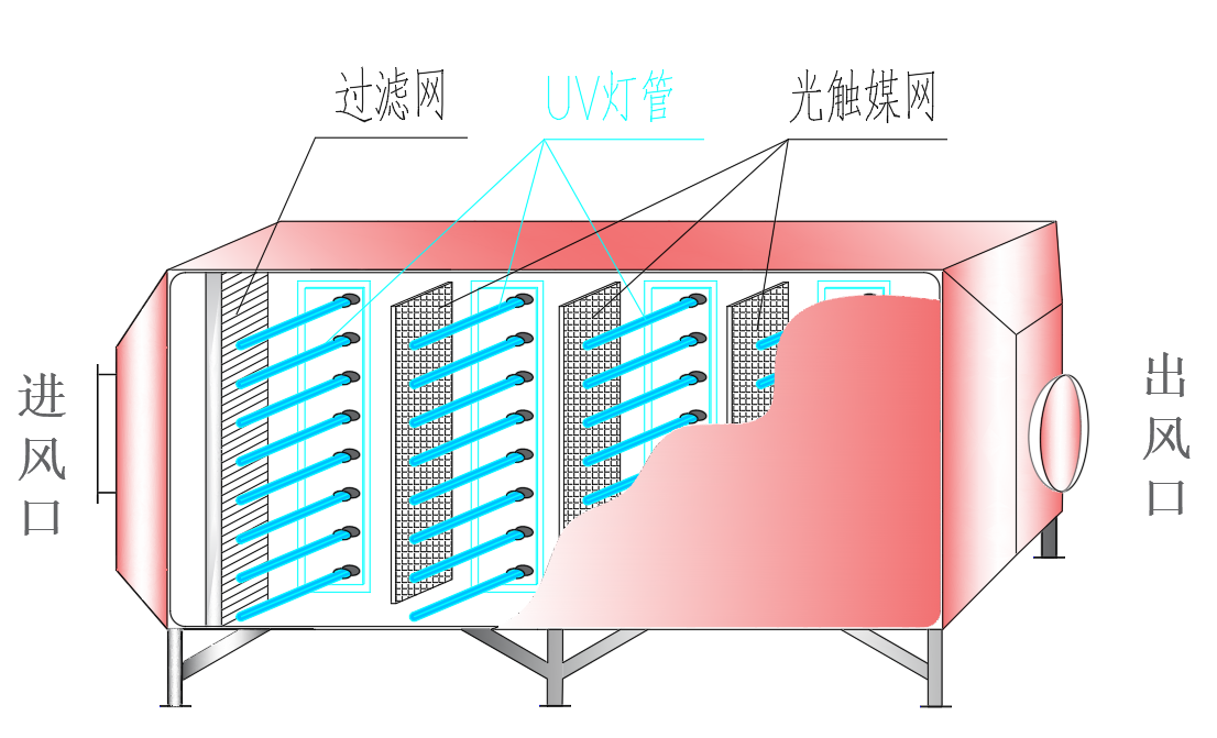 UV光解废气净化设备包含壳体、过滤网、紫外线灯管、光触媒网及进出风口。