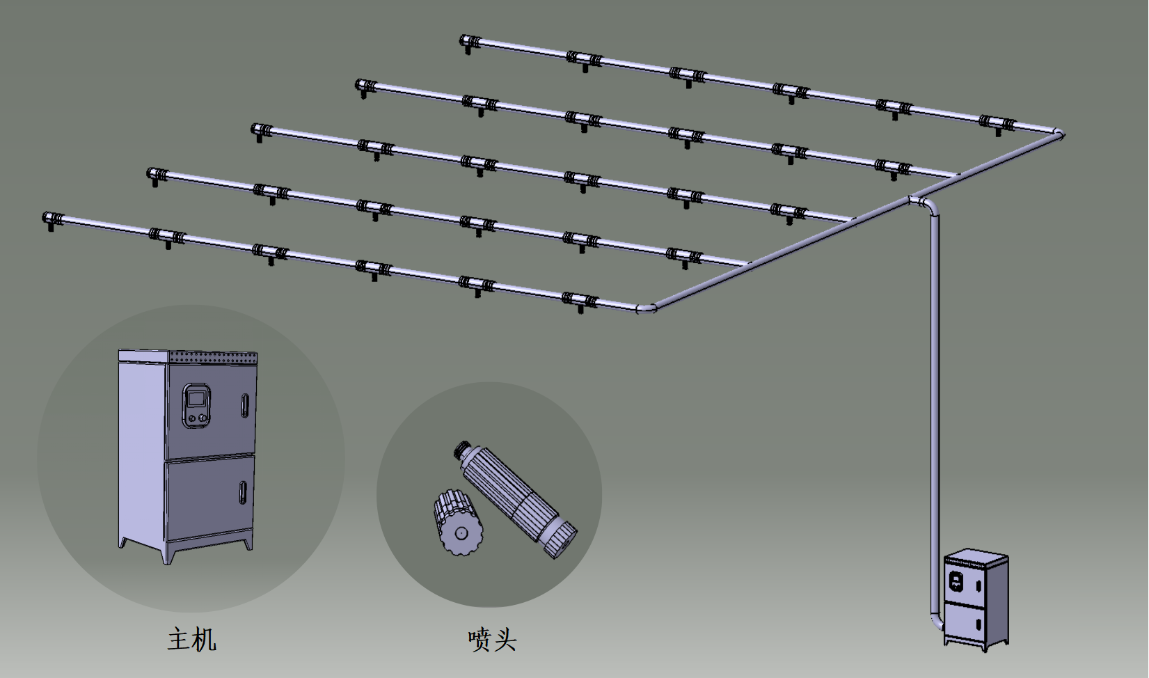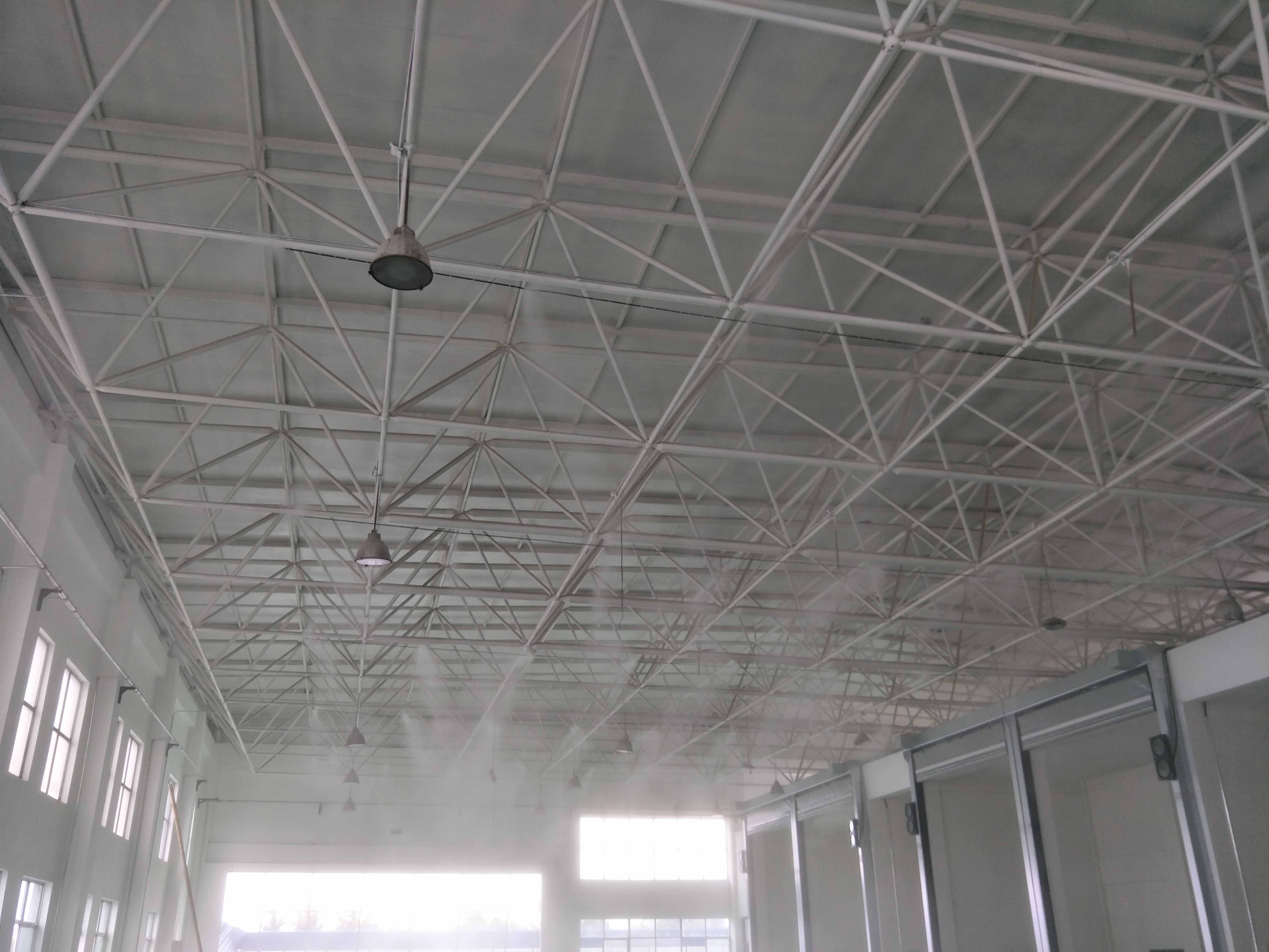 雾化喷淋除臭系统由主机和配套的高压管、喷嘴组成。在除臭区域上方以环绕的方式架设高压管,在高压管上均匀布置雾化喷头,高压管设置高度、间隔距离及喷头距离根据现场情况合理布置。