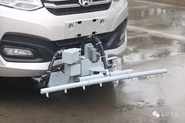 2、前喷水架采用电动推杆控制,可以实现左、右±20°回转和上、下100mm高度范围变幅,最大清洗宽度达1.5米。作业时,系统水压最大可到8MPa。