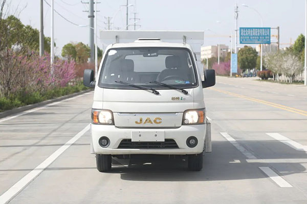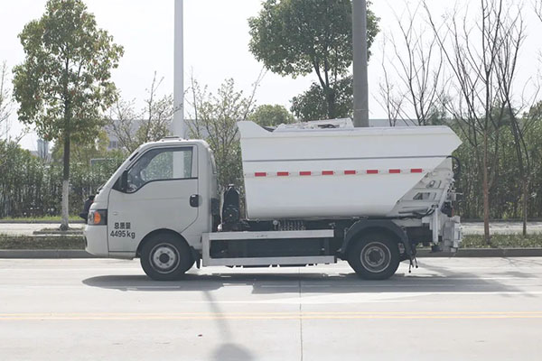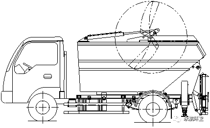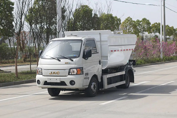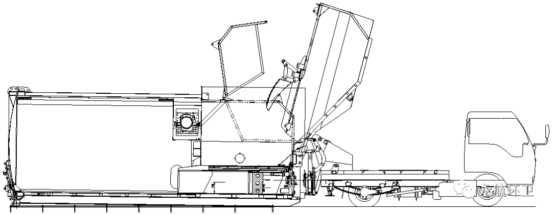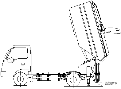 该车采用江淮纯电动二类汽车底盘,加装高位倾翻垃圾箱、翻桶机构、刮板压缩装置、液压系统和电控系统等部件改装而成,主要用于桶装生活垃圾的收集和转运。