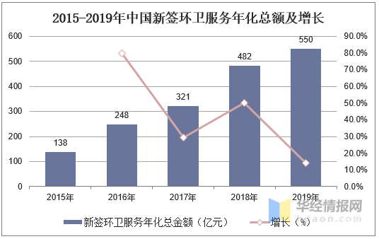 2016年全国新签环卫服务年化总金额为248亿元,同比增长80%。2018年年化总金额创新高,2017-18年年化总金额达到321/482亿元,2019年新签环卫服务年化总金额达550亿元。