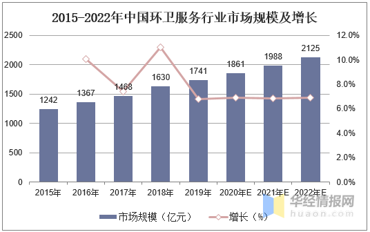 近年来,环卫服务行业市场规模不断增长,据统计,到2019年环卫服务行业市场规模为1741亿元,同比增长6.8%。预计到2022年环卫服务行业市场规模约为2125亿元。