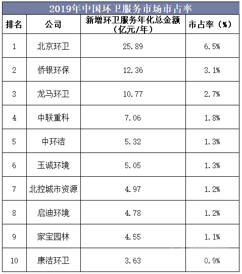 未来随着竞争加剧,行业面临重新洗牌,质量管理、成本和融资能力有限的小企业将出局,龙头企业将凭借自身优势获取更多份额。2019年环卫运营项目新增年服务金额排名前五的公司分别为北京环卫、侨银环保、龙马环卫、中联重科、中环洁。