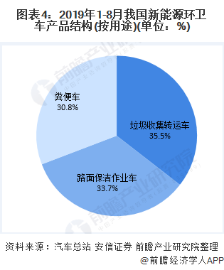 按环卫车用途来看,2019年1-8月,在新能源环卫车的销量占比中,垃圾收集转运车的占比35.5%;其次是路面保洁作业车,占比为33.7%。