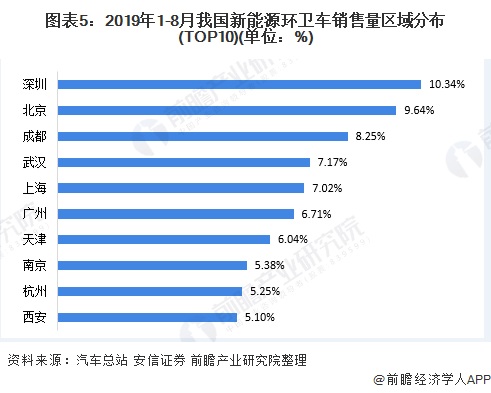 按销售区域来看,2019年1-8月,我国新能源环卫车销量排名前十的城市中,深圳市为10.34%;其次是北京市,占比9.64%。