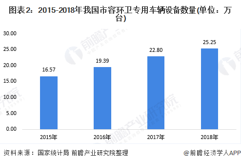环卫车按用途可分为:洒水车、扫路车、洗扫车、吸尘车、垃圾车和除雪车。数据显示,2018年,我国市容环卫专用车辆设备约25.25万台,同比增长2.45万台。