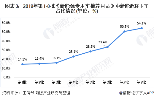 根据2019年工信部发布的1-8批《新能源专用车推荐目录》,新能源环卫车占比逐步提高,由第1批的14.5%提高到第8批的54.1%。新能源环卫车的推广使用将直接带动其销量的增长。