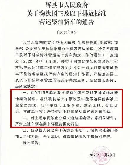 日前,河南辉县市发布公告称:禁止任何单位使用国三车、非法改装车以及不达标的车辆从事运输。除此之外,对上述车辆还禁止办理通行证。