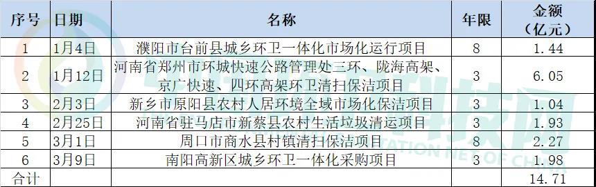 河南省一季度每月都有2个亿级环卫项目中标,共6个项目,其中,有3个为农村环卫项目,2个为城乡环卫一体化项目。可以看出,河南省近期中标的环卫大单服务范围更偏重农村市场。河南省如此重视农村环卫建设,和地方之前颁发的部分文件有关。如2016年12月,河南省下发了《关于全面推进农村垃圾治理的实施意见》,主要目标提出,到2020年,通过农村生活垃圾治理达标验收,全省90%以上的村庄生活垃圾得到有效治理,具备齐全的设备、成熟的治理技术、稳定的保洁队伍、长效的资金保障机制和完善的监管制度……