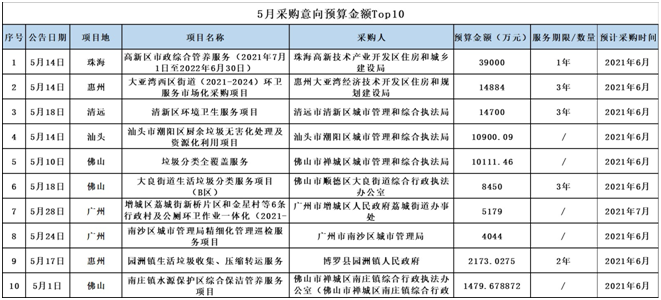 预算金额前三的项目分别为珠海的“高新区市政综合管养服务(2021年7月1日~2022年6月30日)”、惠州的“大亚湾西区街道(2021-2024)环卫服务市场化采购项目”、清远的“清新区环境卫生服务项目”,占本月采购意向预算总金额近半份额。