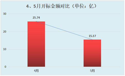 三、5月全省共计92个环卫项目开标,中标总金额15.37亿,较4月下跌了 40%。