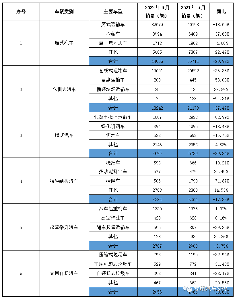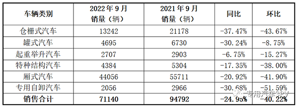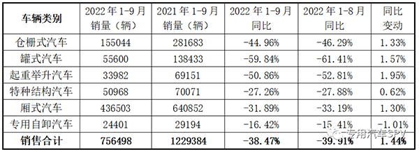 从数据来看,2022年9月专用汽车六大类同比环比均出现较大幅度回落,主要是疫情散发多发及一些极端天气、市场需求恢复相对较弱、企业盈利能力下降等因素影响,企业生产经营较困难。2022年1-9月累计销售专用汽车六大类产品共75.65万辆,同比下滑38.47%,较2022前8月提升1.44个百分点。其中,厢式汽车累计销售43.65万辆,同比下滑31.89%;仓栅式汽车累计销售15.5万辆,同比下滑44.96%;罐式汽车累计销售5.56万辆,同比下滑59.84%;特种结构汽车累计销售5.10万辆,同比下滑27.26%;起重举升汽车累计销售3.40万辆,同比下滑50.86%;专用自卸汽车累计销售2.44万辆,同比下滑16.42%。2022年1-9月专用汽车六大类产品销量情况统计表
