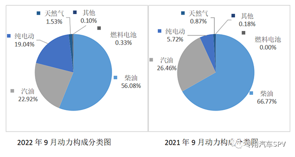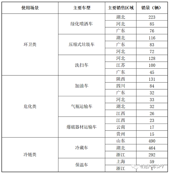从排放标准来看,9月份销售的专用汽车80%以上为国六车,其次是EV(以纯电动和燃料电池为动力的车型),如下图。从产品能源结构来看,专用汽车产品新能源化表现明显,2022年9月纯电动专用汽车渗透率达到19.04%,比去年同期提升13.32个百分点。同时燃料电池和天然气占比明显提升。从使用场景来看,9月份环卫类专用汽车共销售6289辆,主要产品为绿化喷洒车、压缩式垃圾车、洗扫车等,主要销往湖北、河北等省份。9月份冷链类专用汽车共销售4065辆,产品有冷藏车、保温车、疫苗运输车等,主要销往山东、湖北等农副产品大省。9月危化类专用汽车共销售1559辆,主要是加油车、运油车、气瓶运输车和爆破器材运输车等,主要销往陕西、四川、河北等地。2022年9月危化、环卫、冷链类主要车型销往主要省市统计表