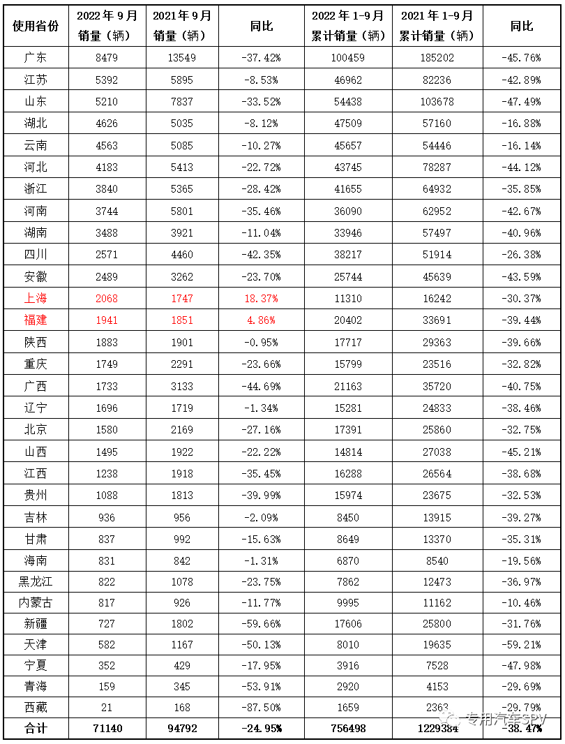 2022年9月我国31个省份、自治区、直辖市实现专用汽车销售7.1万辆,仅上海和福建同比增长,其他各省市同比均呈现不同程度的下滑,尤其是新疆、西藏、天津等地受疫情影响较大,同比下滑超50%以上,其次贵州、四川等地的自然灾害对当地也有较大影响。当月上牌数排名前五的省份是广东省0.85万辆,同比下滑37.42%;江苏省当月上牌0.54万辆,同比下滑8.53%;山东省0.52万辆,同比下滑33.52%;湖北省0.46万辆,同比下滑8.12%;云南当月上牌0.45万辆,同比下滑10.27%。2022年1-9月各省市整体较去年同期平均降幅36%。北京、上海、广州、深圳等经济发达城市和武汉、郑州等农产品集聚地是专用车产品主要流向地。9月份,Top20的城市中仅上海和无锡实现销量正增长,分别同比增长18.37%和38.15%(见下表)。2022年9月各省市专用汽车产品需求情况统计表